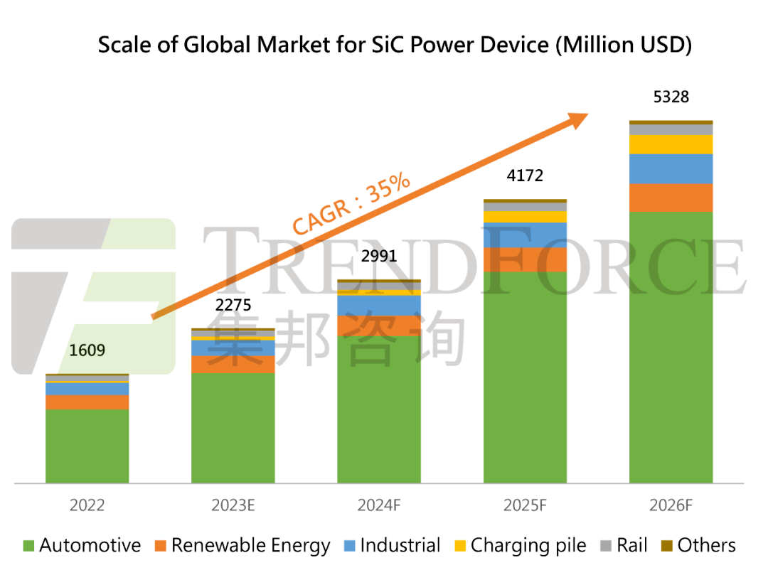 展望未來,TrendForce集邦咨詢預期,至2026年SiC功率元件市場規模可望達53.3億美元。主流應用仍倚重電動汽車及再生能源,電動汽車產值可達39.8億美元、CAGR約38%;再生能源達4.1億美元、CAGR約19%。